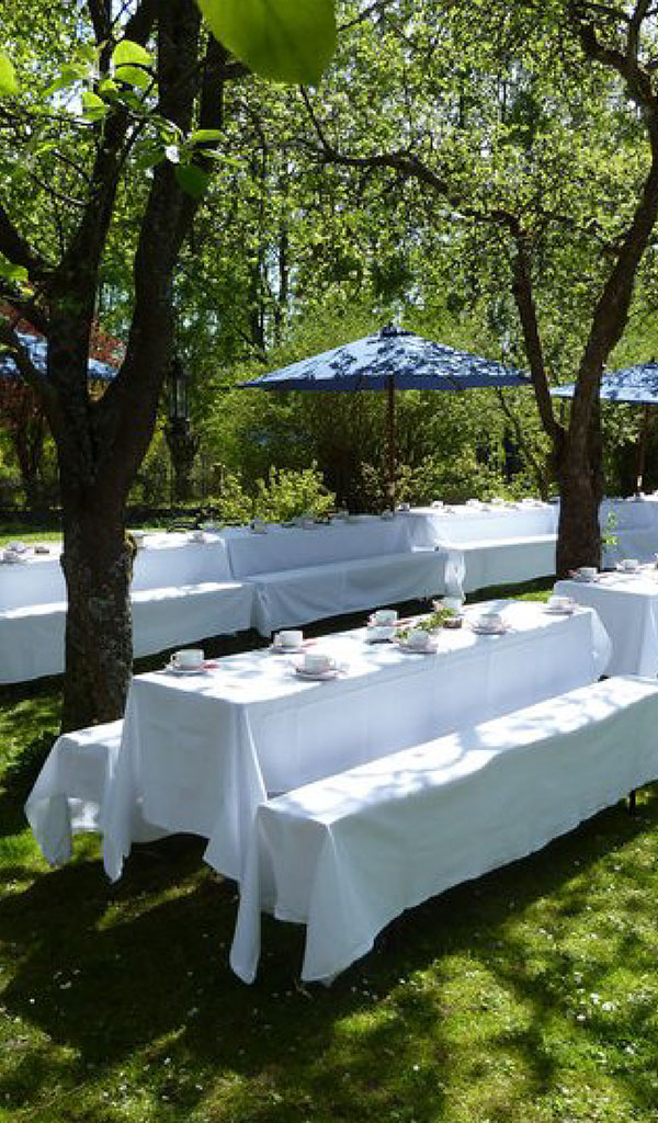 Weiß eingedeckte TIsche unter Apfelbäumen – der alte Obstgarten ist wie geamcht für schöne Sommertage bei Kaffee und Kuchen. Eine Stmosphäre wie aus einer anderen Zeit.